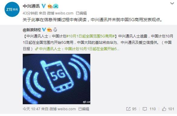 中兴通讯回应称:并未就中国5G商用时间发表观点