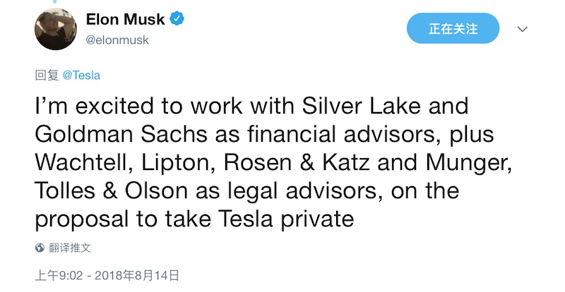 上表明,正在与银湖本钱(Silver Lake)和高盛(Goldman Sachs)协作,推动将特斯拉私有化一事。Musk 还表明,本次特斯拉私有化的法律顾问为 Wachtell, Lipton, Rosen & Katz 和 Munger, Tolles & Olson 这两家律师事务所。